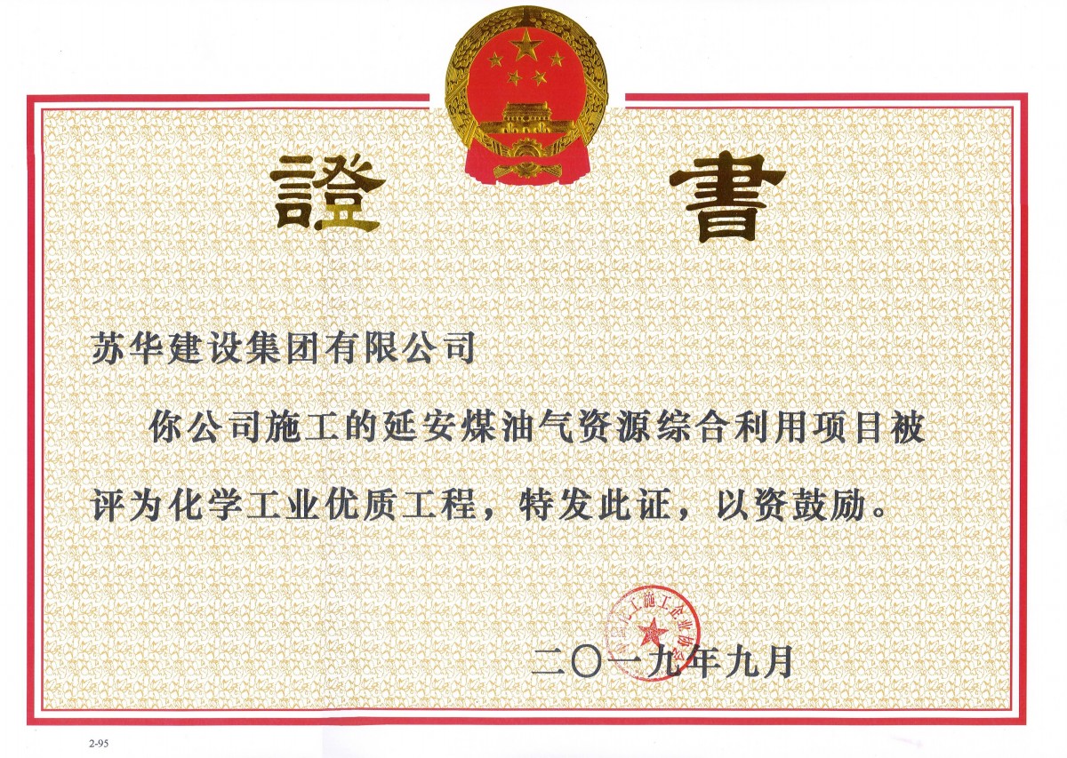 最近,我公司又獲得了由中國化工施工企業(yè)協(xié)會頒發(fā)的全國化學(xué)工業(yè)優(yōu)質(zhì)工程獎狀。陜西延長石油延安能源化工有限責任公司建設(shè)的延安煤油氣資源綜合利用項目熱動力站項目。由我蘇華建設(shè)集團有限公司上海分公司承建。該項...
